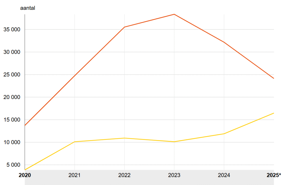 - De dalende instroom wordt veroorzaakt door externe factoren zoals het einde van de oorlog in Syrië (50 procent van de asielaanvragen waren vóór de val van Assad in december 2024 Syrisch)